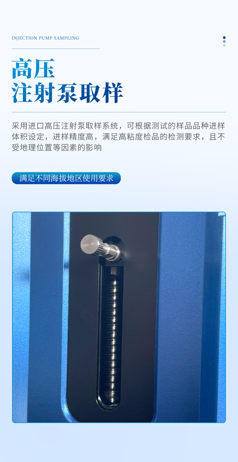 |采用進口高壓注射泵取樣系統,可根據刻試的樣品品種進樣體積設定,進樣精度高,滿足高粘度檢品的檢測要求,且不受地理位置等因素的影響,滿足不同海拔地區的使用要求,