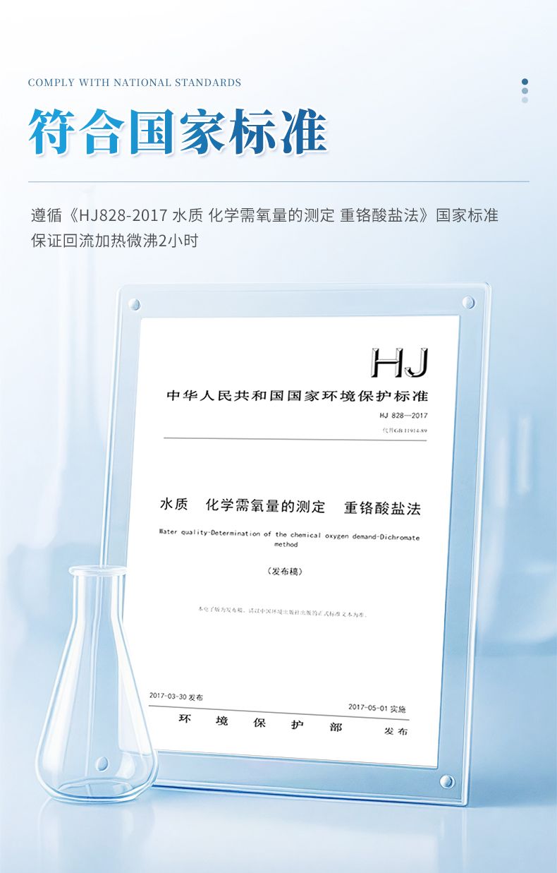 化學需氧量(COD)智能回流消解器遵循了國家標準《HJ828-2017 水質 化學需氧量的測定 重鉻酸鹽法》的基本原則,保證了回流加熱微沸2小時的消解操作,試劑溶液的配制和加入量與國標法一致,確保可靠準確的分析結果。