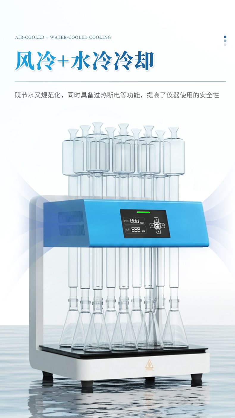 3. 安全性能優:采用玻璃毛刺回流管代替球形回流管,并以風冷+水冷技術取代傳統自來水冷卻方式,既可以節水又能使儀器規范化,同時具備過熱斷電等功能,提高了儀器使用的安全性。 4.面板易清潔:采用石墨烯加熱板,表面光滑、平整,表面污漬一擦即凈,可減少操作不當對儀器的損壞;
