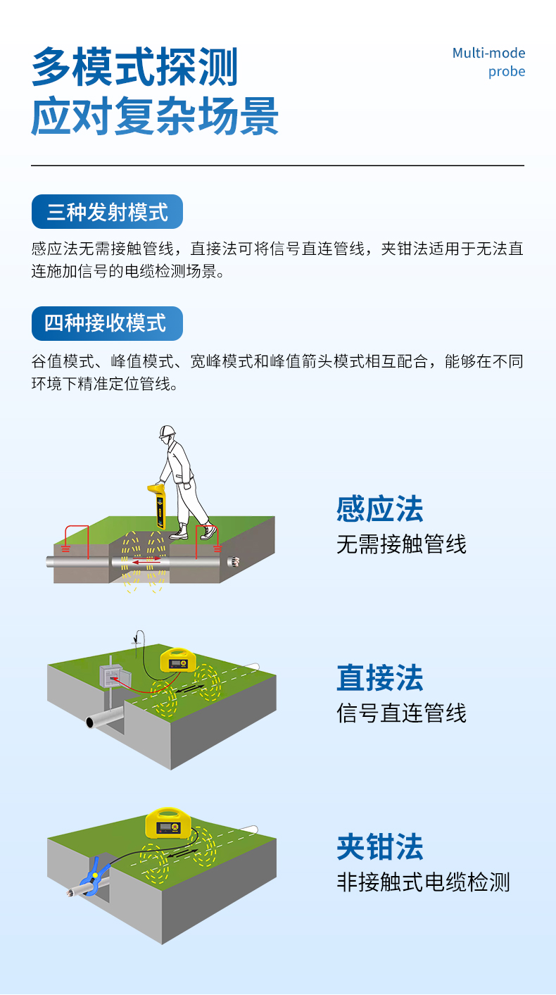 1、 發(fā)射機(jī)功能: 具有感應(yīng)法、直接法和夾鉗法三種信號(hào)施加模式,適合不同場(chǎng)合需要。