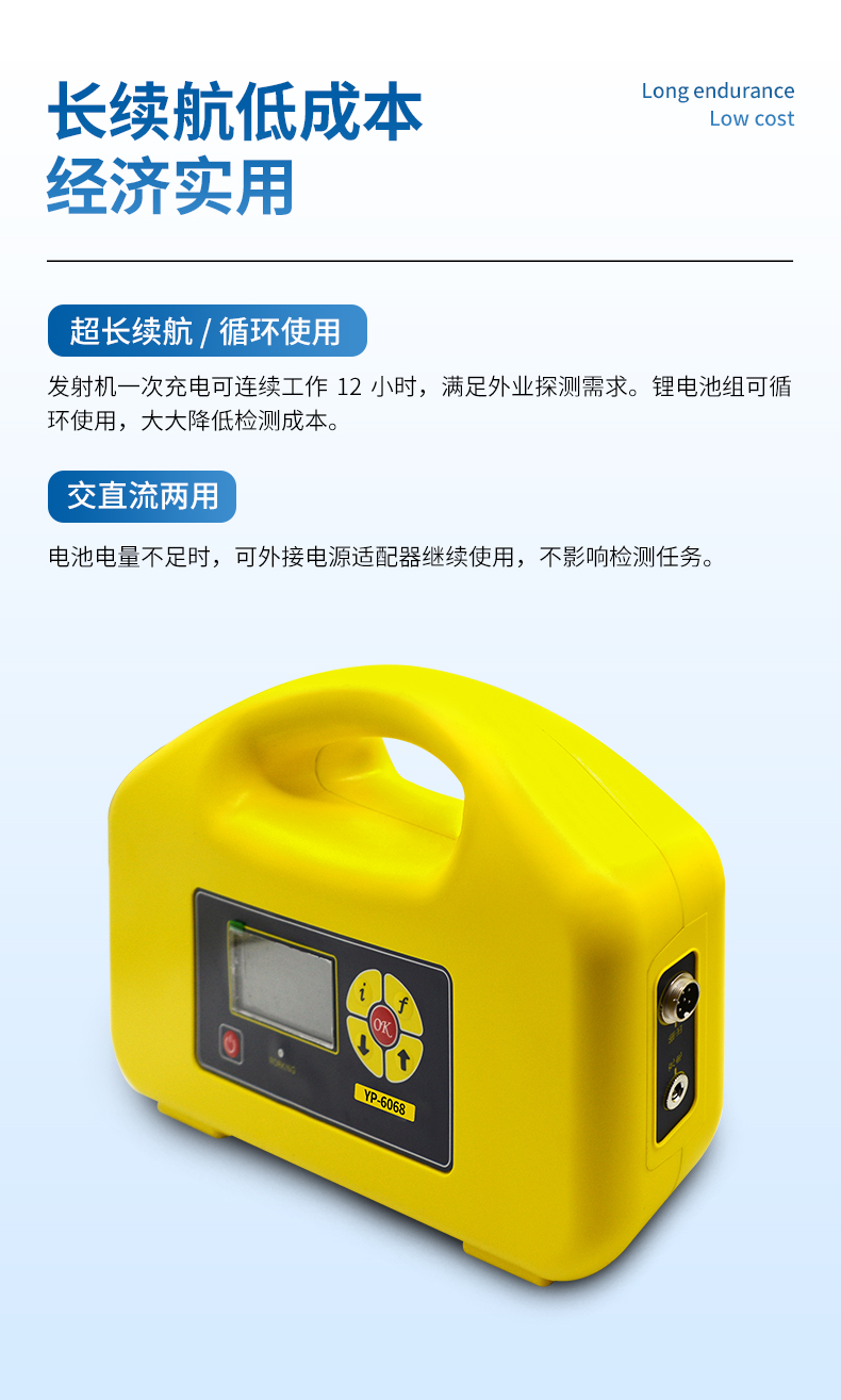 發(fā)射機(jī)配備了大容量鋰電池組, 一次充電, 可滿足外業(yè)探測(cè)一個(gè)工作日供電需要, 并可循環(huán)使用,大大降低了檢測(cè)成本。