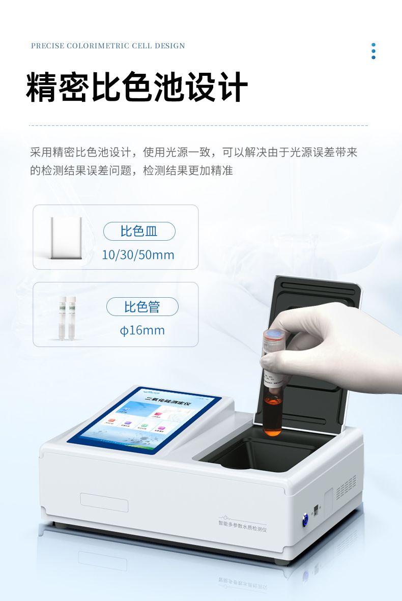 3、采用精密比色池設計,使用光源一致,可以解決由于光源誤差帶來的檢測結果誤差問題,檢測結果更加精準。