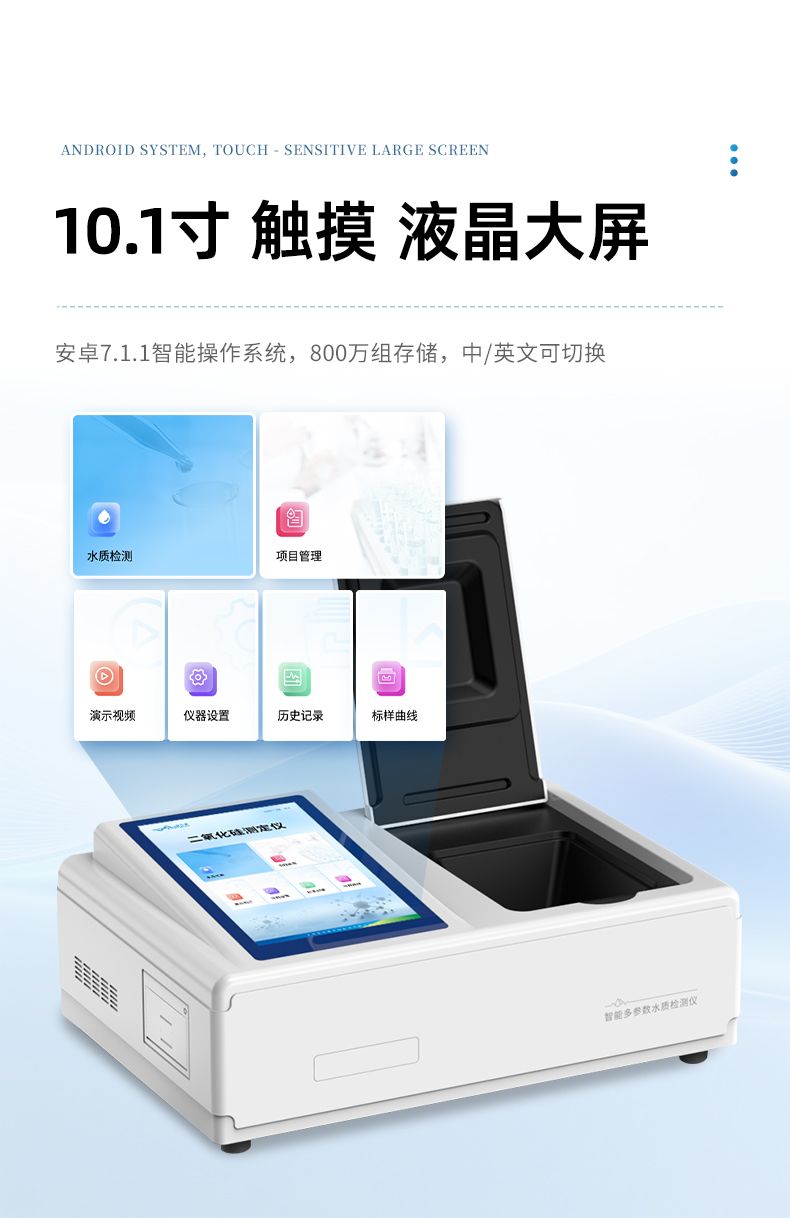 本儀器主要檢測水質二氧化硅濃度指標,兼具智能數據分析功能,圖表、列表顯示數據,分析一目了然;高清晰度彩色液晶觸摸顯示屏,Android智能操作系統,中文顯示界面,中英文鍵盤,人性化操作,使用更簡單。