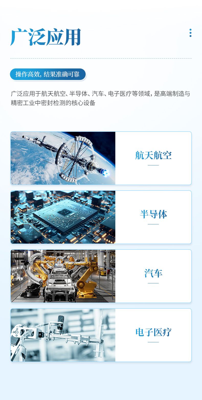 氦質(zhì)譜檢漏儀是采用質(zhì)譜學(xué)原理、以氦氣為示漏氣體的高精度無(wú)損檢漏設(shè)備,憑借氦氣大氣含量低、質(zhì)荷比特征鮮明的優(yōu)勢(shì),實(shí)現(xiàn)超高靈敏度檢漏,可精準(zhǔn)定位并定量漏點(diǎn)。設(shè)備支持真空噴氦、吸槍掃描、背壓累積等多種檢漏模式,適配真空 / 帶壓容器、密封組件、精密器件等不同檢測(cè)需求,廣泛應(yīng)用于航天航空、半導(dǎo)體、汽車、電子醫(yī)療等領(lǐng)域,是高端制造與精密工業(yè)中密封檢測(cè)的核心設(shè)備。