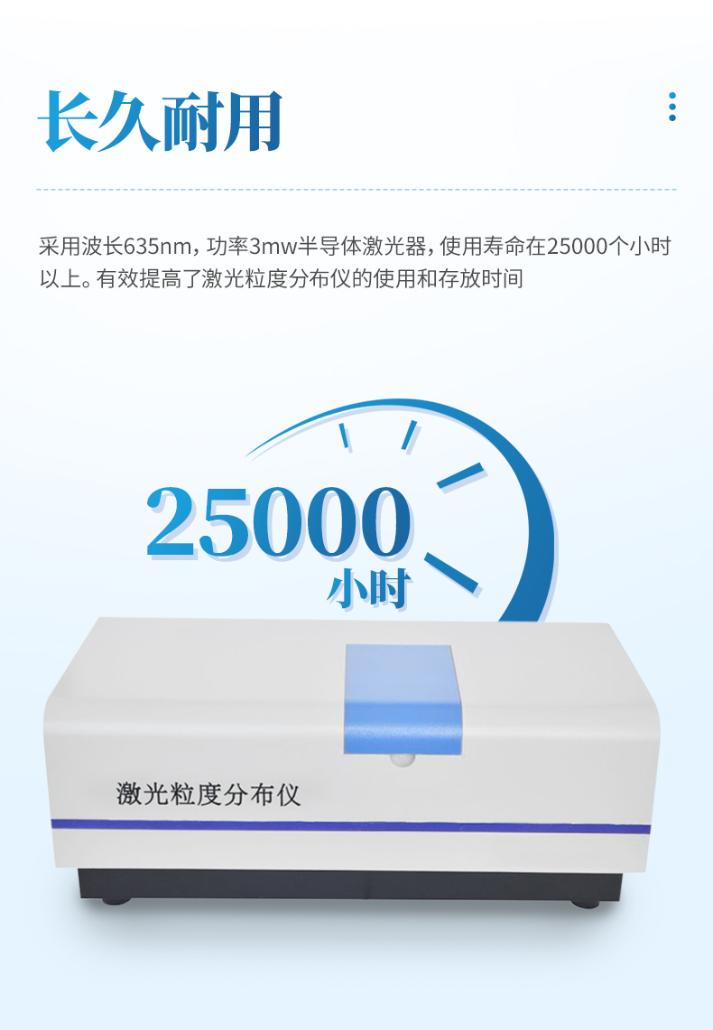 采用波長635nm,功率3mw半導體激光器,使用壽命在25000個小時以上有效提高了激光粒度分布儀的使用和存放時間。