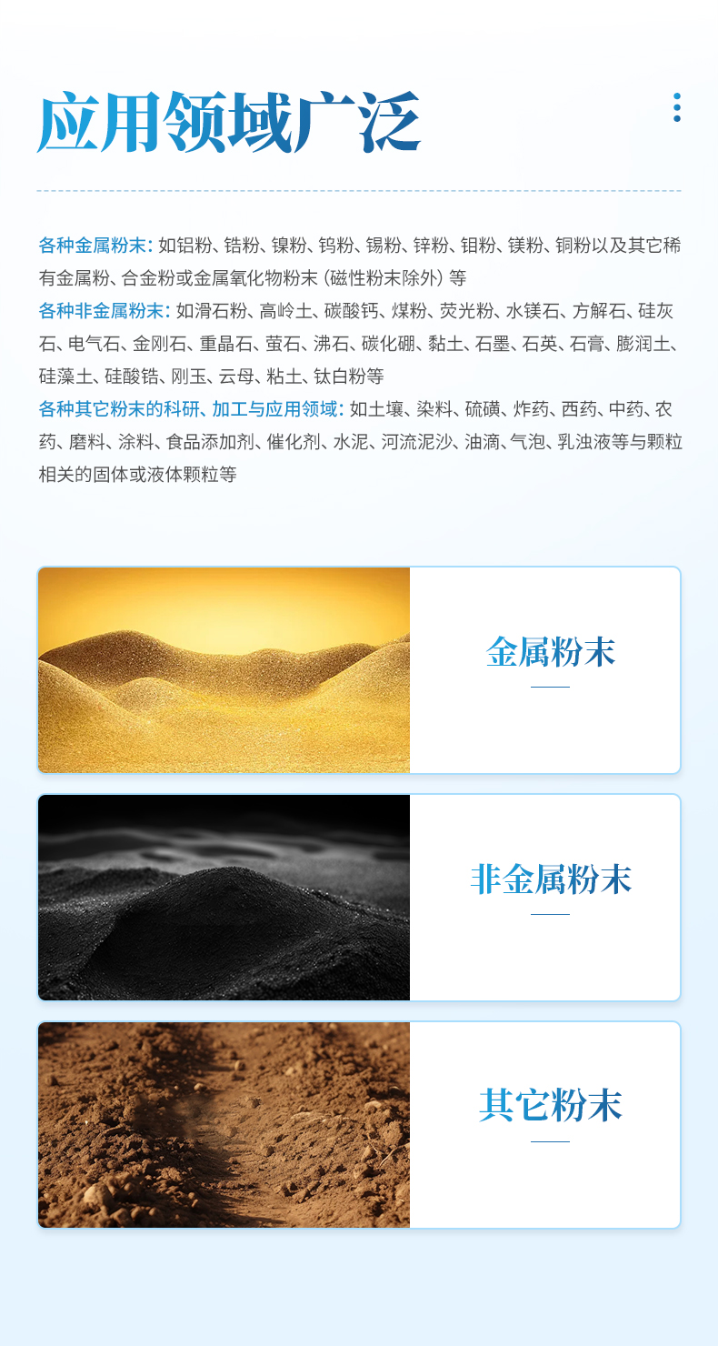 3. 各種其它粉末的科研、加工與應用領(lǐng)域:如土壤、染料、硫磺、炸藥、西藥、中藥、農(nóng)藥、磨料、涂料、食品添加劑、催化劑、水泥、河流泥沙、油滴、氣泡、乳濁液等與顆粒相關(guān)的固體或液體顆粒等。