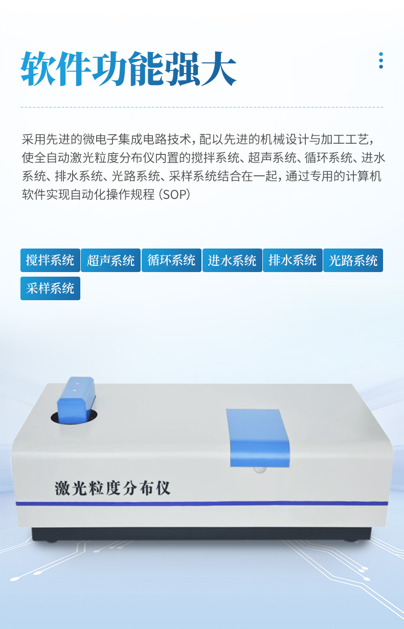 全自動激光粒度分布儀是最新研制的高性能激光粒度儀,它具有測量范圍寬(0.04-500mm)、自動化程度高等特點。采用專門設(shè)計的由大規(guī)模集成電路工藝制造的大尺寸高靈敏度光電探測器陣列,有多達9個后向探測器,保證了測試下限達到40納米;自動攪拌、超聲、循環(huán)、進水、排水系統(tǒng),使儀器實現(xiàn)了全自動智能化的操作;采用高精度的數(shù)據(jù)傳輸與處理電路等一系列先進的技術(shù)和制造工藝,使該儀器具有準確可靠、測試速度快、重復性好的特點。