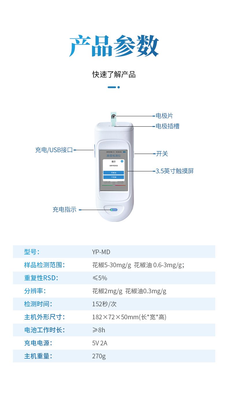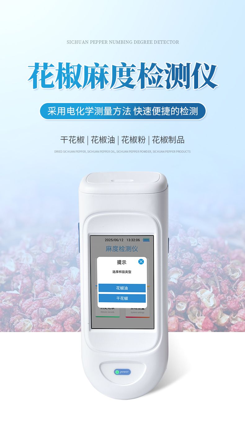 手持式麻度檢測儀采用電化學測量方法,可快速、便捷地檢測各種花椒及花椒制品中的天然山椒素的含量,適用于干花椒、花椒油、花椒粉等花椒及其制品的快速檢測。