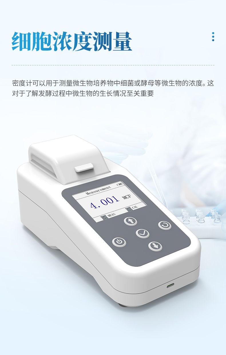 吸光度測量:密度計可以用于測量微生物培養物在特定波長下的吸光度。這對于研究微生物培養物中特定成分的含量或變化非常有用。