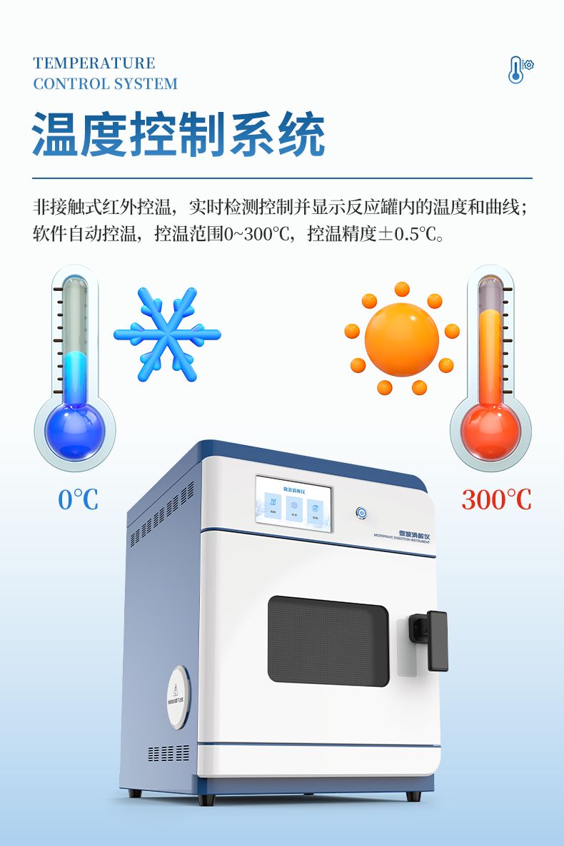 溫度控制系統:非接觸式紅外控溫,實時檢測控制并顯示微波消解反應罐內的溫度和曲線。