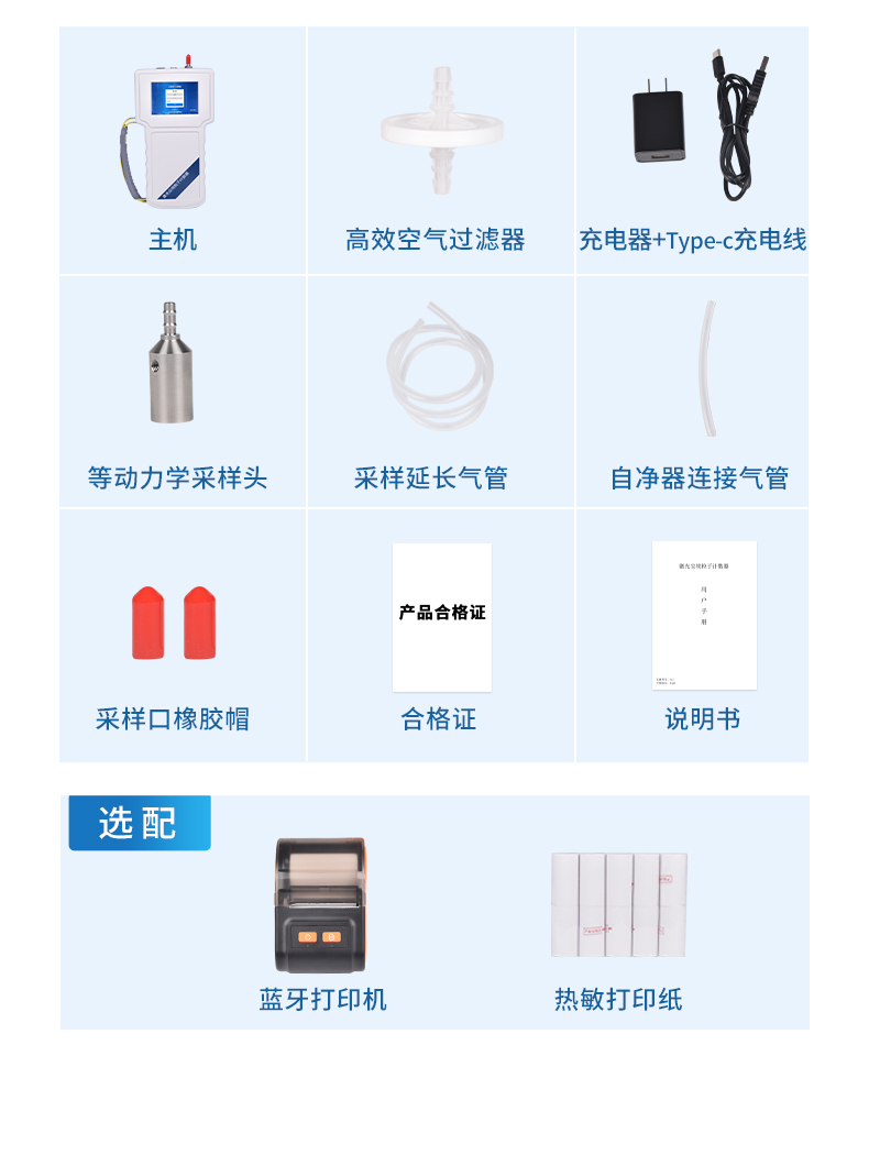 ?標(biāo)配:等動力采樣頭、充電適配器、熱敏打印紙、高效空氣過濾器、熱敏打印機(jī)、測量延長氣管