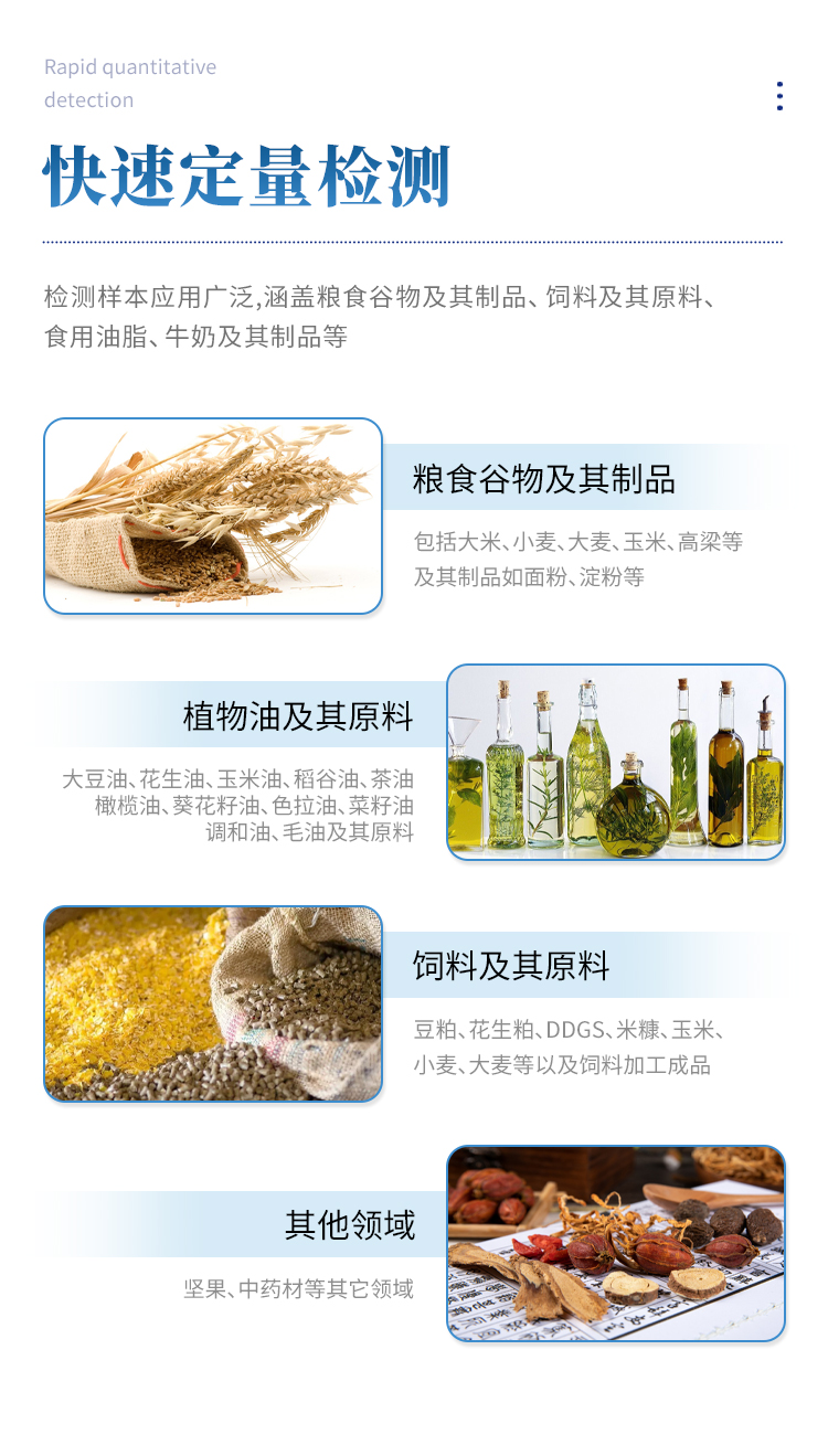 黃曲霉素B1 | 2-30ug/kg(谷物) | 玉米、小麥、麥麩、豆粕、花生粕、米糠粕、玉米蛋白粉.玉米胚芽粕、膨化玉米、DDGS和噴漿玉米皮及成品飼料 |