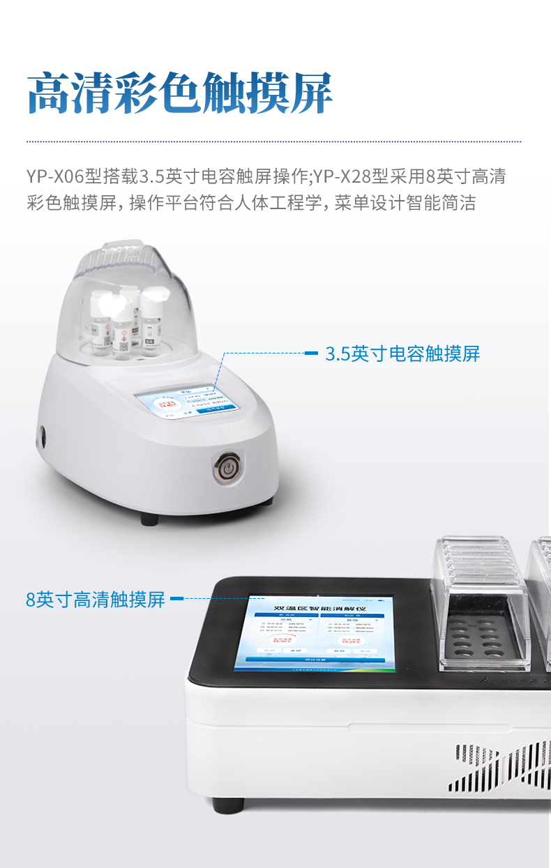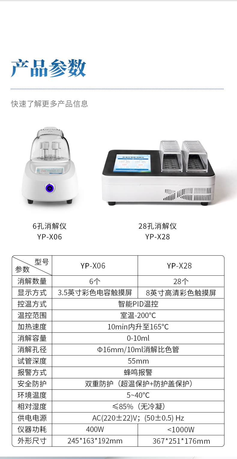YP-X06型便攜式智能消解儀是一款依據環(huán)保行業(yè)標準《HJ/T399-2007》研發(fā)的新款多功能快速消解儀,搭載3.5寸電容觸屏操作,智能安全,升溫速度快,溫度均勻穩(wěn)定,可對多種檢測參數如:COD、總磷、總氮等項目進行一鍵消解。