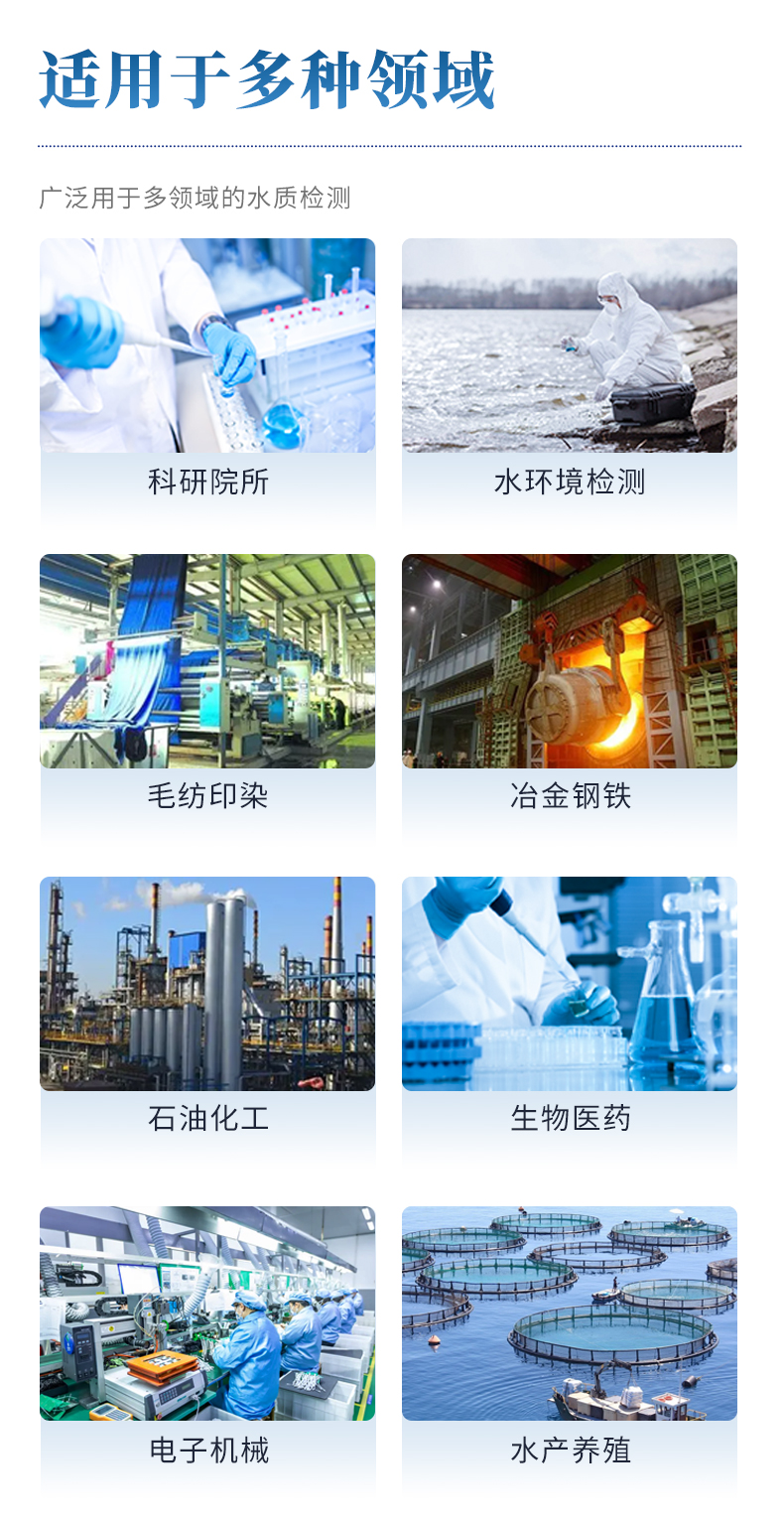YP-X06型便攜式智能消解儀可廣泛應用于科研院所、污水工程、水環(huán)境檢測、石油化工、冶金鋼鐵、生物醫(yī)藥、食品乳業(yè)、毛紡印染、電子機械、水產養(yǎng)殖、光伏、皮革、造紙等領域的水質檢測。