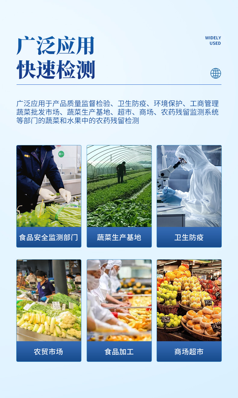 它可以廣泛應用于產品質量監督檢驗、衛生防疫、環境保護、工商管理、蔬菜批發市場、蔬菜生產基地、超市、商場、農藥殘留監測系統等部門的蔬菜和水果中的農藥殘留檢測。