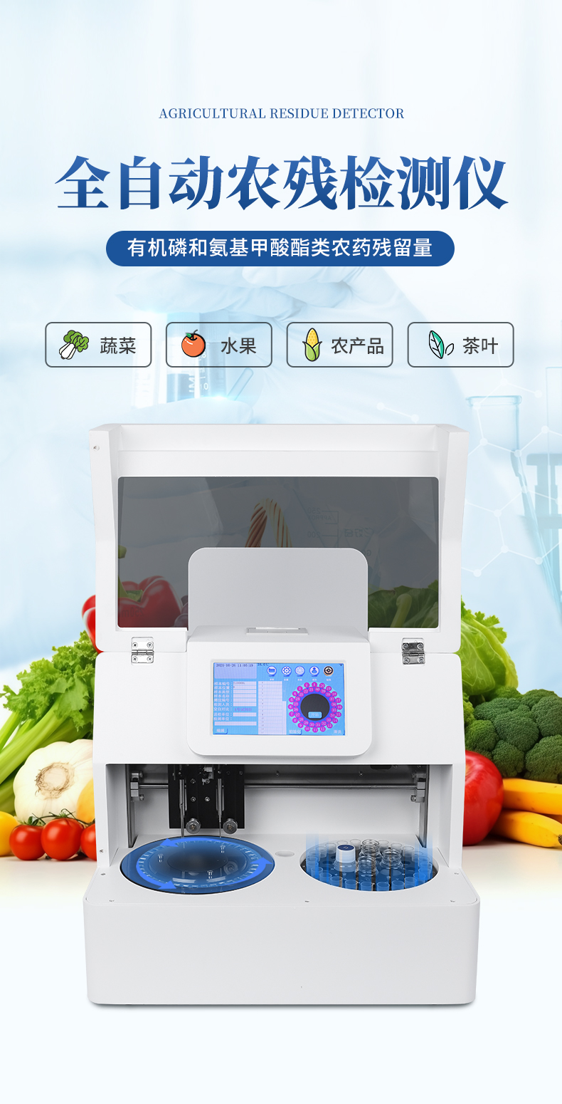 全自動農殘檢測儀主要用于定量分析蔬菜、水果等樣本的農藥殘留成分。檢測系統主要包括項目參數、試劑位置、儀器調校、設置、樣本信息、結果查詢、初始化、全盤清洗等功能模塊。具有分析速度適中、無交叉污染、消耗品少、試劑開放等特點。