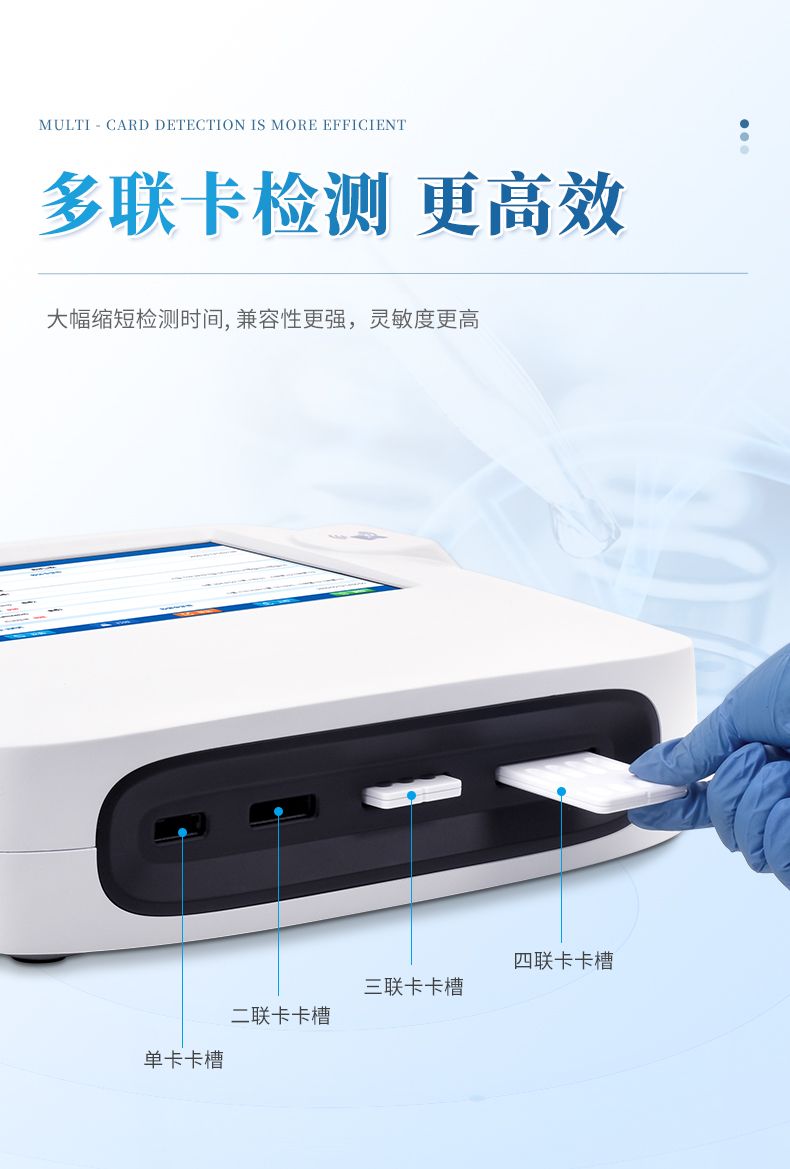 11、檢測時間:< 5秒 (單卡及多聯(lián)卡);可對樣本進行膠體金定性/半定量檢測。