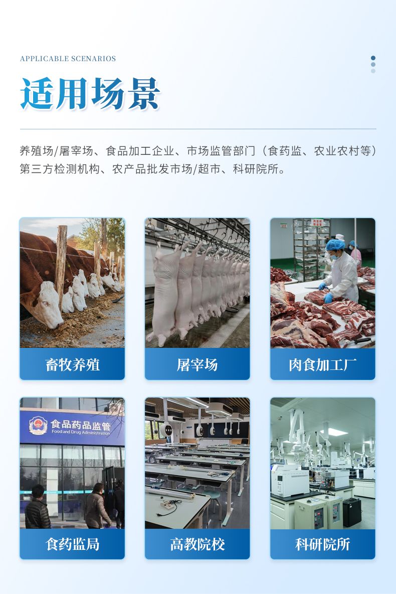 主要應用場景:養(yǎng)殖場/屠宰場、食品加工企業(yè)、市場監(jiān)管部門(食藥監(jiān)、農(nóng)業(yè)農(nóng)村部等)、第三方檢測機構、農(nóng)產(chǎn)品批發(fā)市場/超市、科研院所。