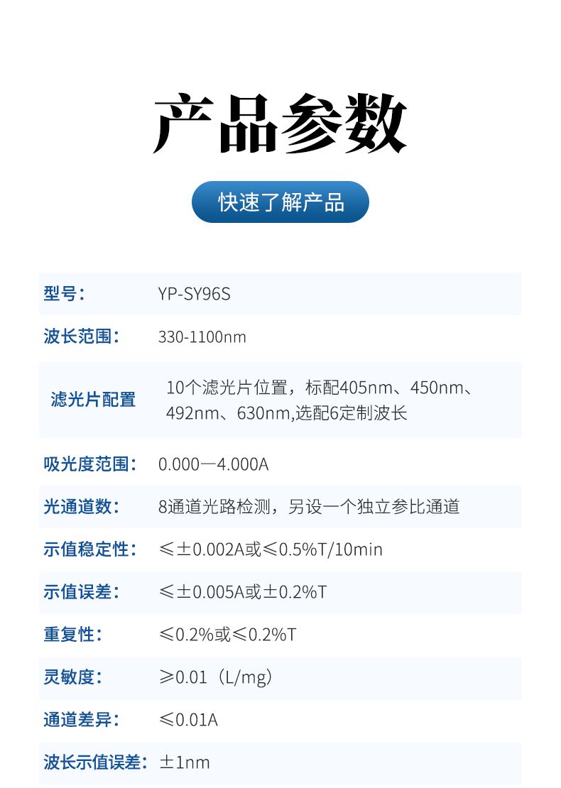*濾光片配置:10個濾光片位置,標配405nm、450nm、492nm、630nm,選配6定制波長