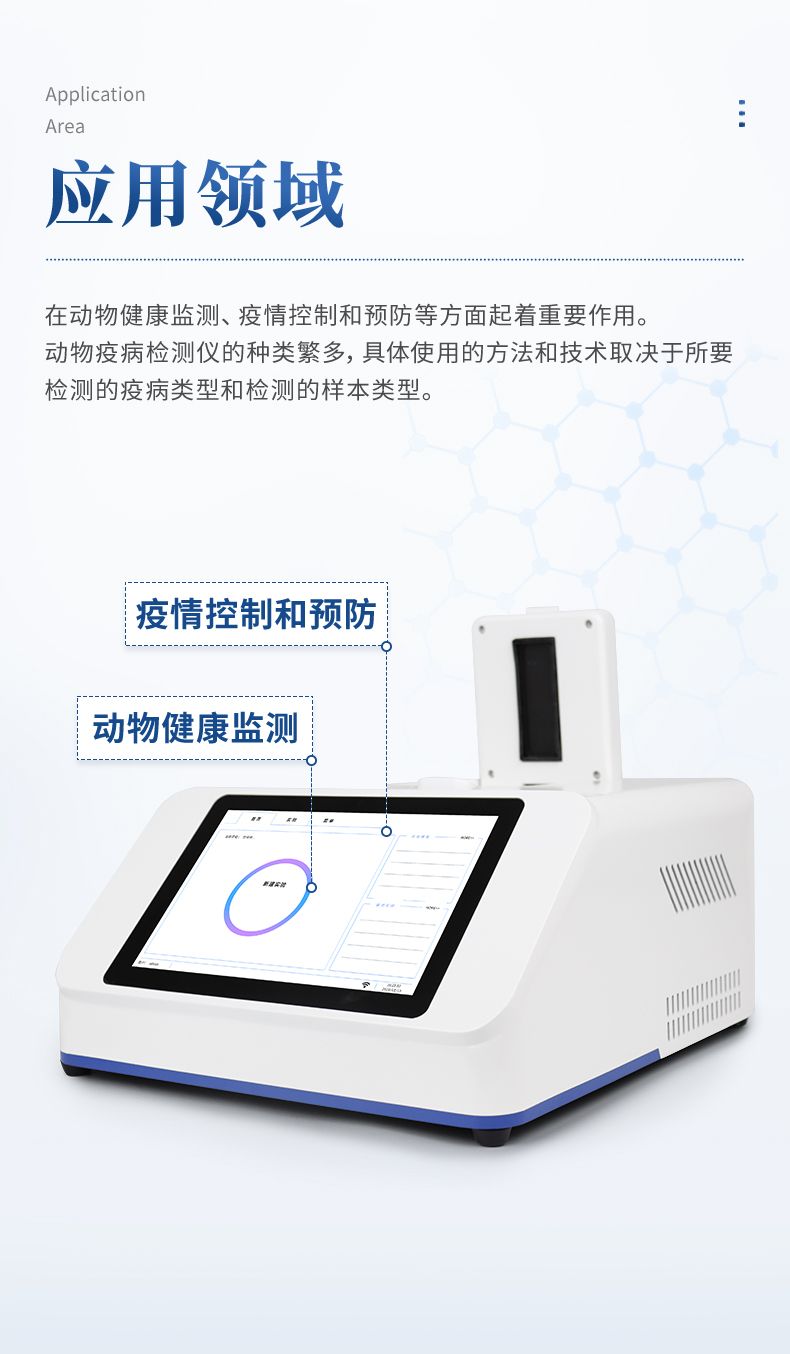 動(dòng)物/寵物疫病檢測(cè)儀是一種用于檢測(cè)動(dòng)物身體樣本中是否存在病原體或疫病的設(shè)備。它在動(dòng)物健康監(jiān)測(cè)、疫情控制和預(yù)防等方面起著重要作用。動(dòng)物疫病檢測(cè)儀的種類繁多,具體使用的方法和技術(shù)取決于所要檢測(cè)的疫病類型和檢測(cè)的樣本類型。