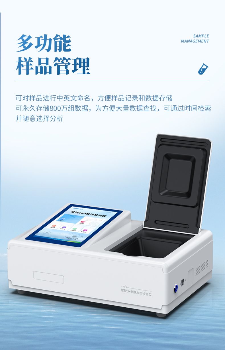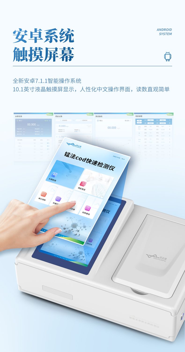 本儀器采用錳法測定水中的COD指標,又稱CODMn或高錳酸鹽指數,兼具智能數據分析功能,圖表、列表顯示數據,分析一目了然;高清晰度彩色液晶觸摸顯示屏,Android智能操作系統,中文顯示界面,中英文鍵盤,人性化操作,使用更簡單。