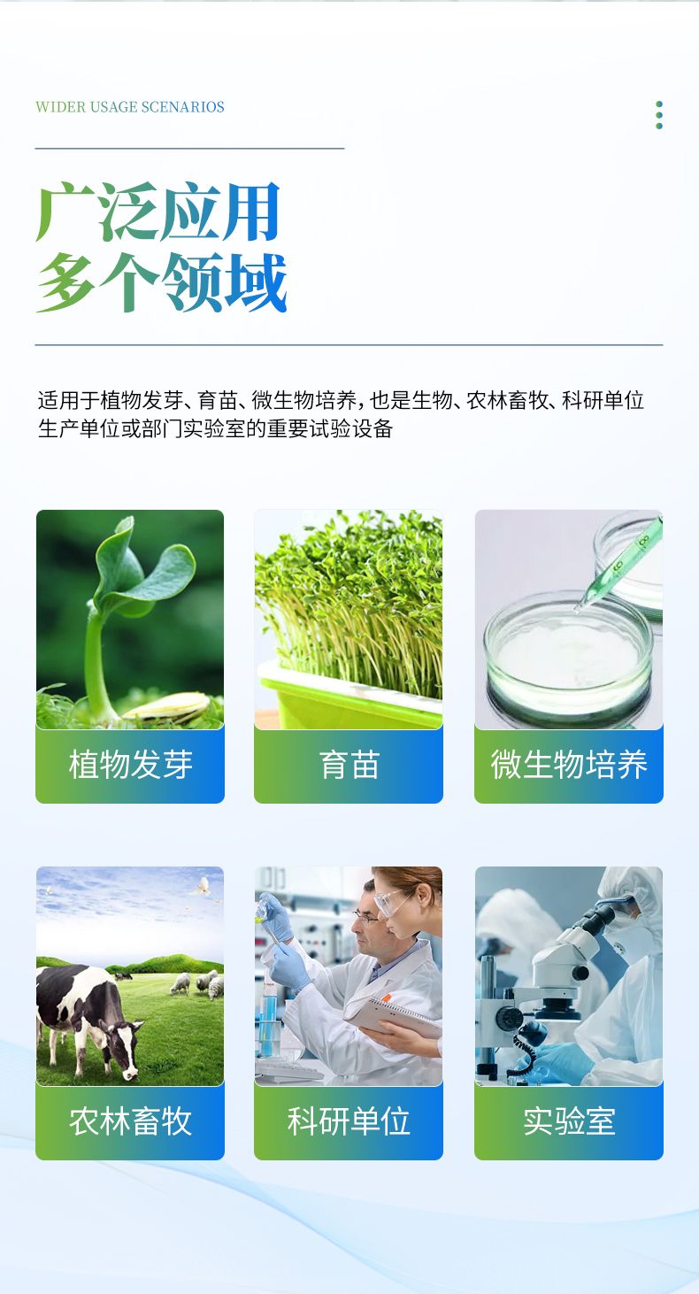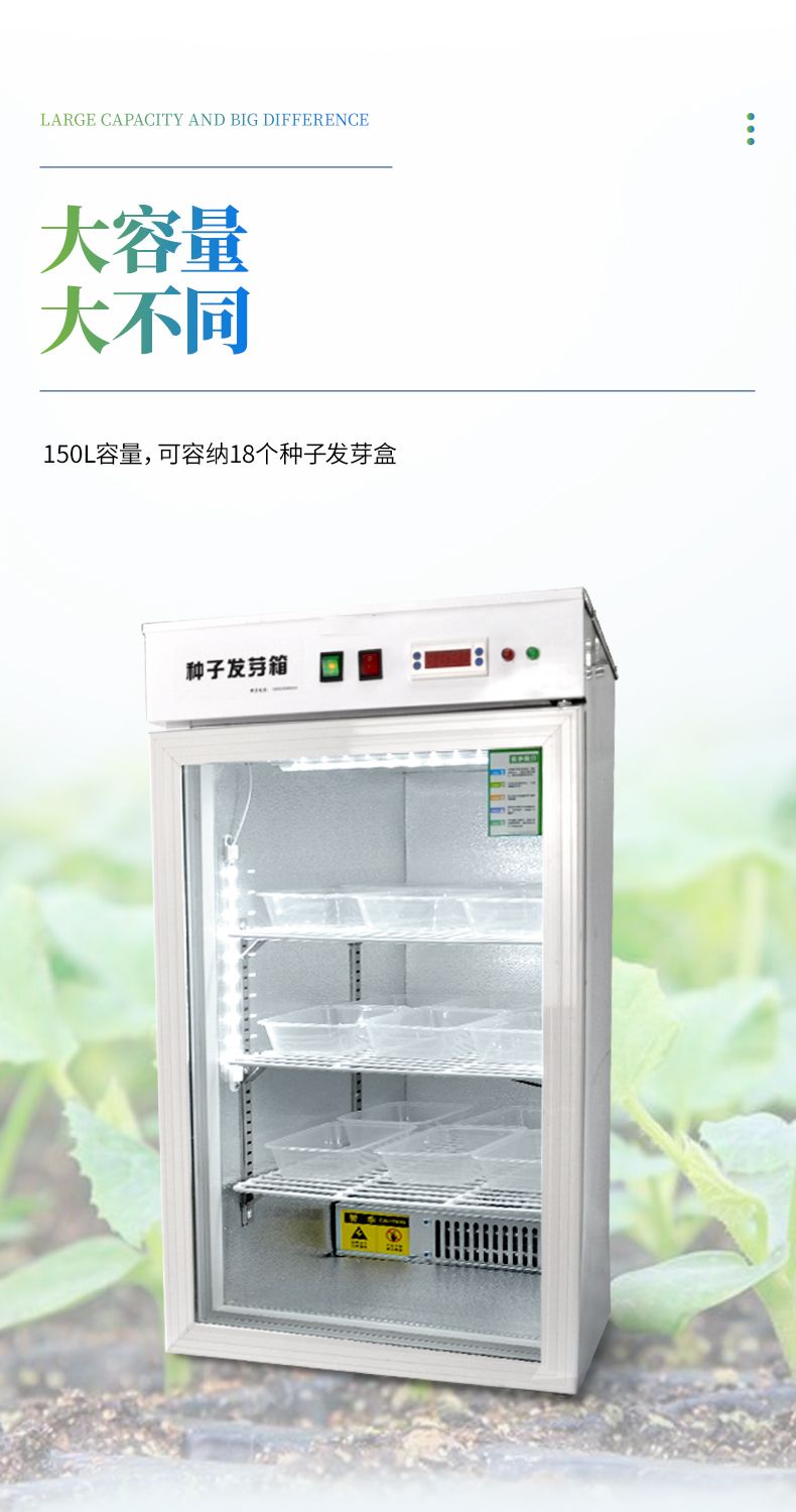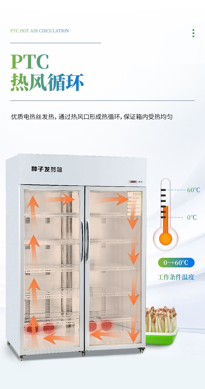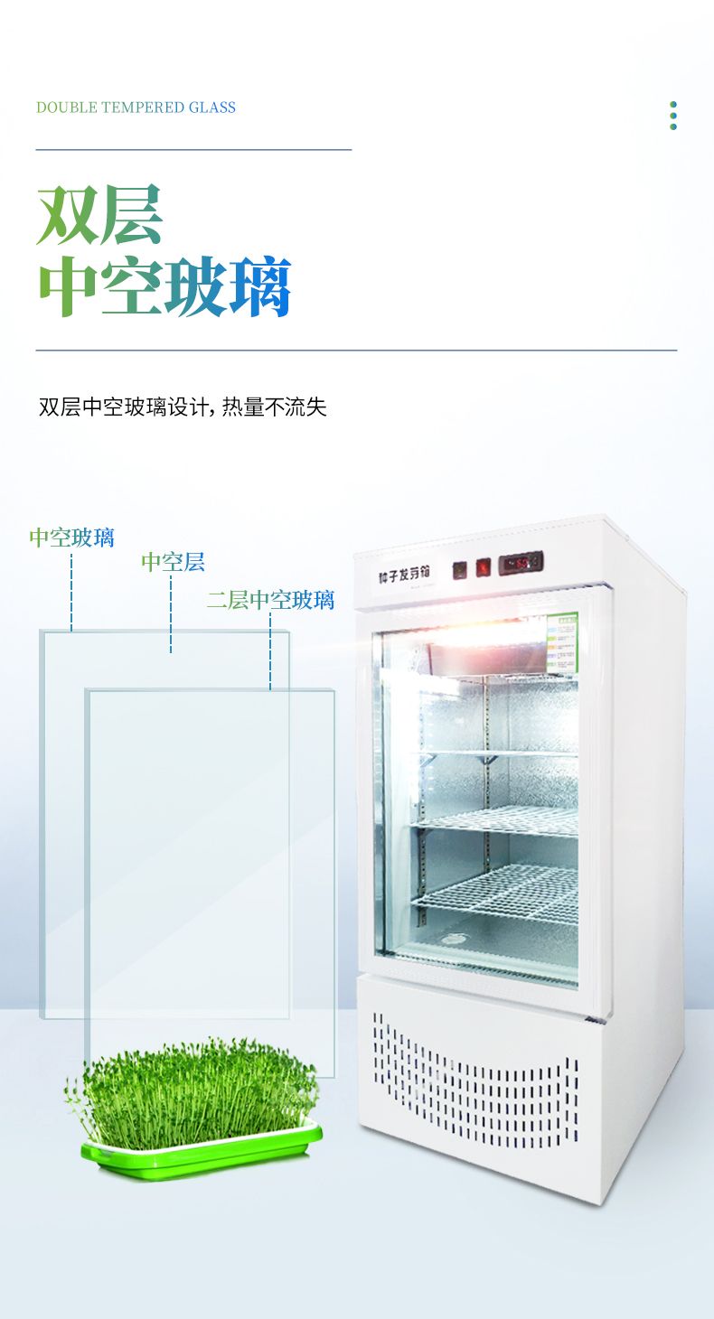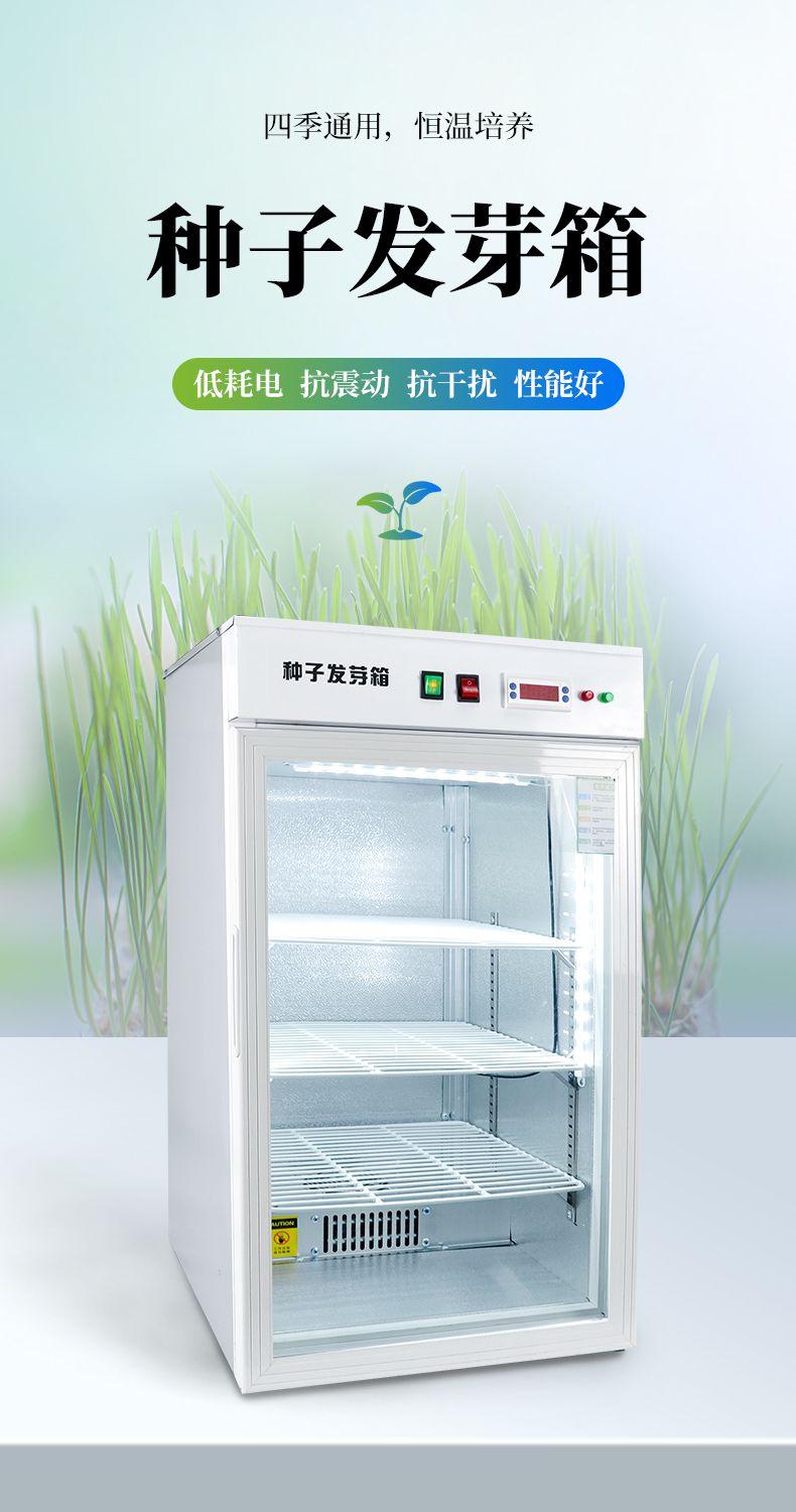 2、此箱可在不同地區不同季節使用不同的種子恒溫快速發芽,由于恒溫的作用,使種子的蛋白酶等化學物質迅速分解反應,避免了溫差出芽造成的能量丟失,使種子出芽后抗病力強,提高幼苗免疫能力,縮短了種子的出芽的時間。經該器械出的幼芽,芽苗質量好,成活率高。