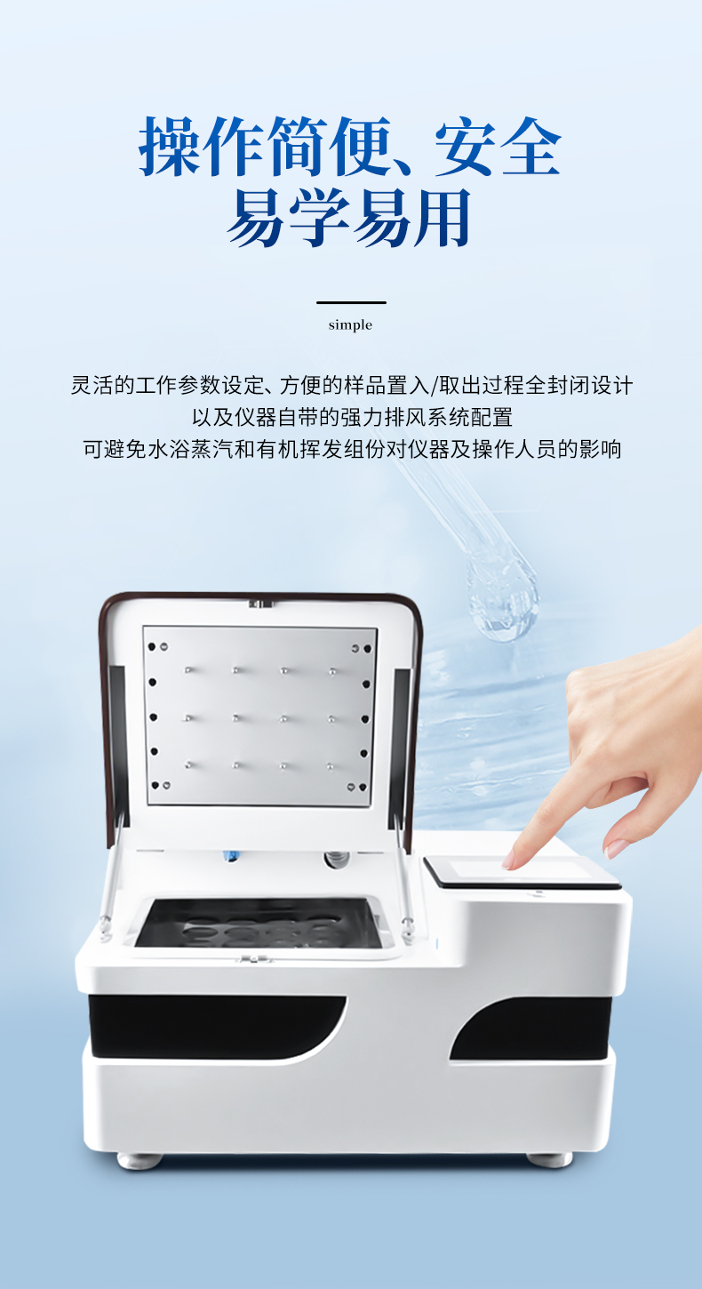 6、操作簡(jiǎn)便、安全:靈活的工作參數(shù)設(shè)定、方便的樣品置入/取出過程,易學(xué)易用;全封閉設(shè)計(jì)以及儀器自帶的強(qiáng)力排風(fēng)系統(tǒng)配置,可避免水浴蒸汽和有機(jī)揮發(fā)組份對(duì)儀器及操作人員的影響。