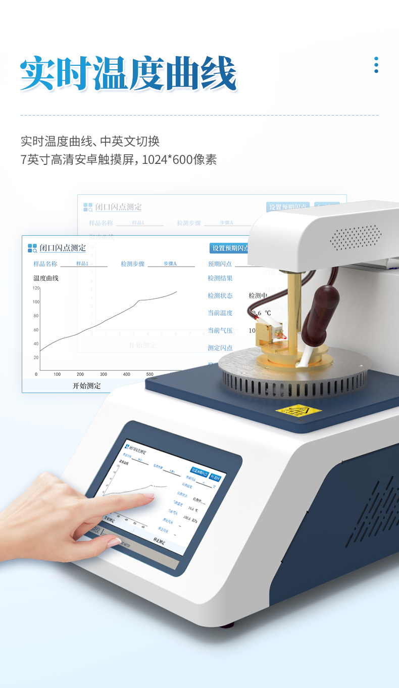 儀器按照GB/T 3536—2008方法規(guī)定的升溫曲線加熱,溫度接近預(yù)設(shè)閃點(diǎn)值時(shí)自動(dòng)點(diǎn)火,當(dāng)出現(xiàn)閃點(diǎn)和燃點(diǎn)時(shí)儀器自動(dòng)鎖定結(jié)果,并顯示和打印,同時(shí)啟動(dòng)風(fēng)機(jī)自動(dòng)對(duì)加熱器進(jìn)行冷卻。