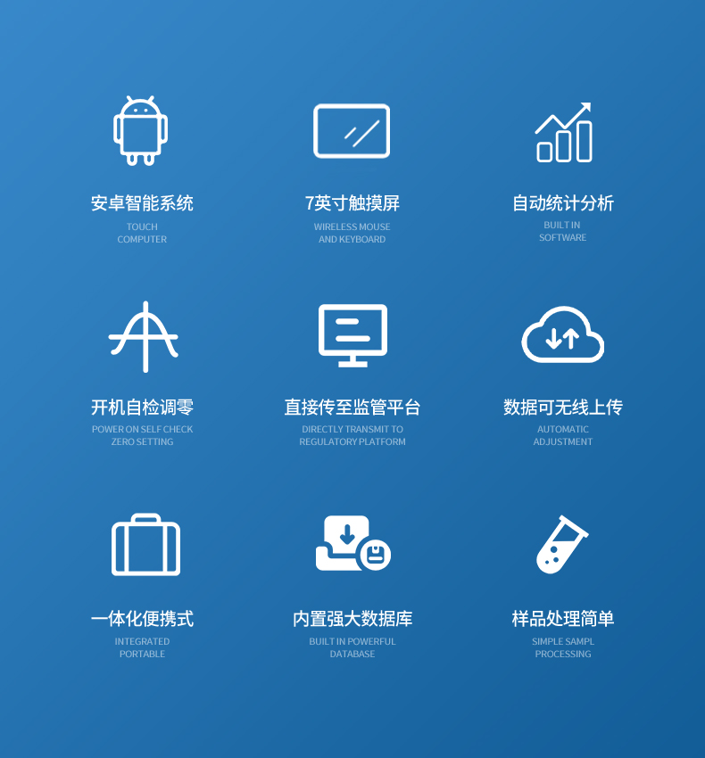 2、智能化程度高,儀器具有自檢功能:具有開機自檢和調零功能,具有自動檢測重復性功能。