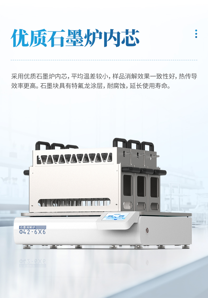 采用優(yōu)質(zhì)石墨爐內(nèi)芯,平均溫差較小,樣品消解效果一致性好,熱傳導(dǎo)效率更高。石墨塊具有特氟龍涂層,耐腐蝕,延長使用壽命。