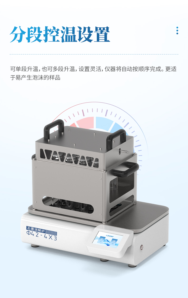 分段控溫設(shè)置,即可單段升溫,也可多段升溫,設(shè)置靈活,儀器將自動按順序完成。更適于易產(chǎn)生泡沫的樣品。