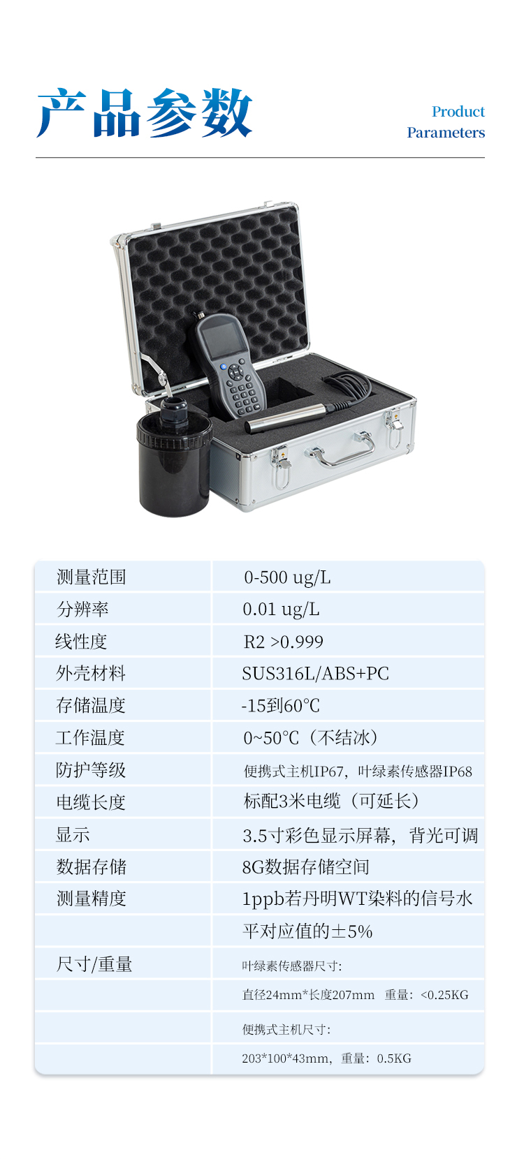 防護(hù)等級:便攜式主機IP67,葉綠素傳感器IP68;