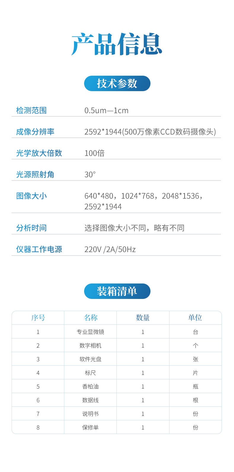| 1 | 檢測范圍 | 0.5um—1cm |