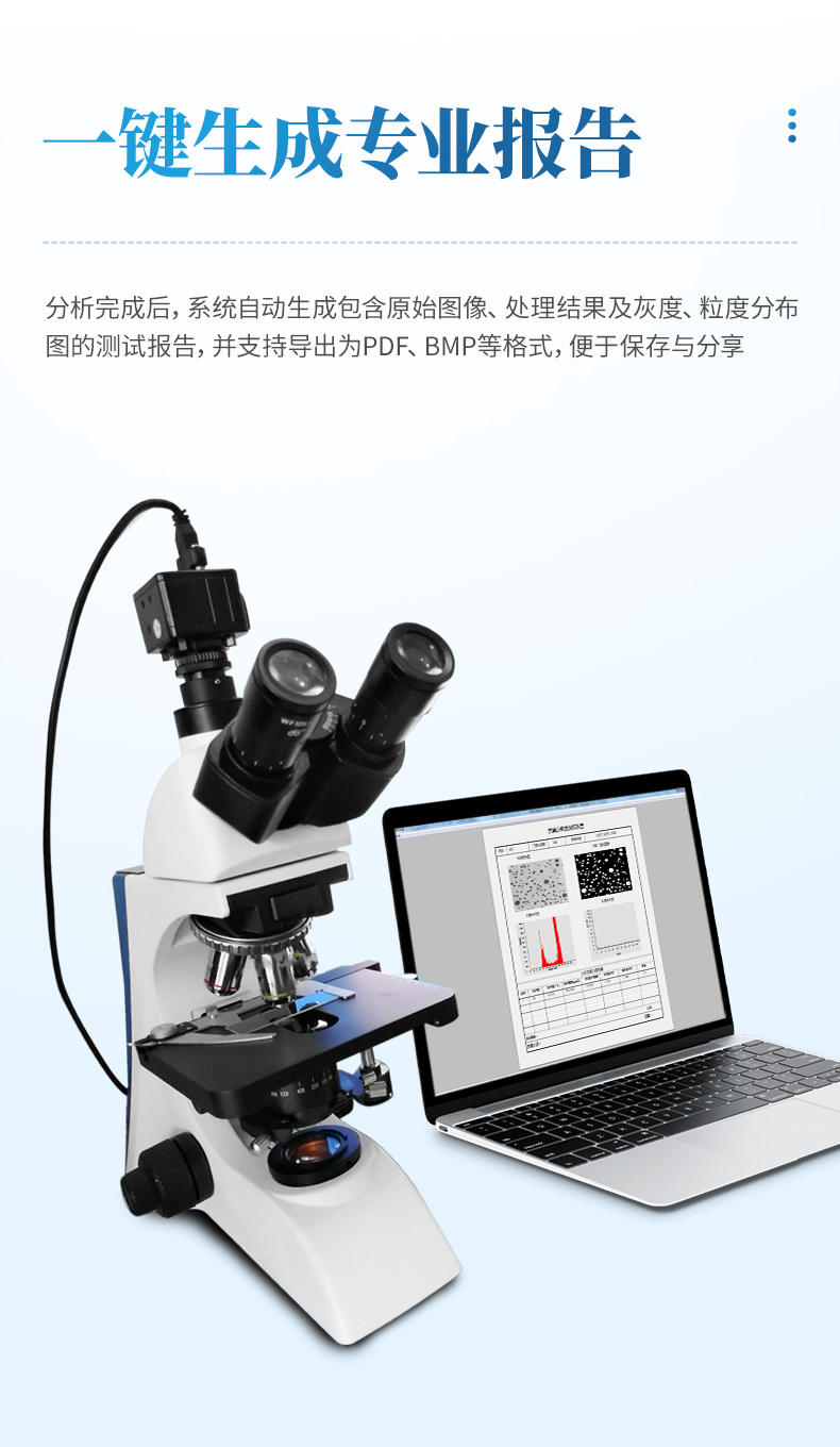報告報告包括:樣品名稱、二值化閾值、參考標準、原始圖、二值化后圖像、灰度分布圖和粒度分布圖、軟件分析得到的項目參數(shù)等。如下圖所示: