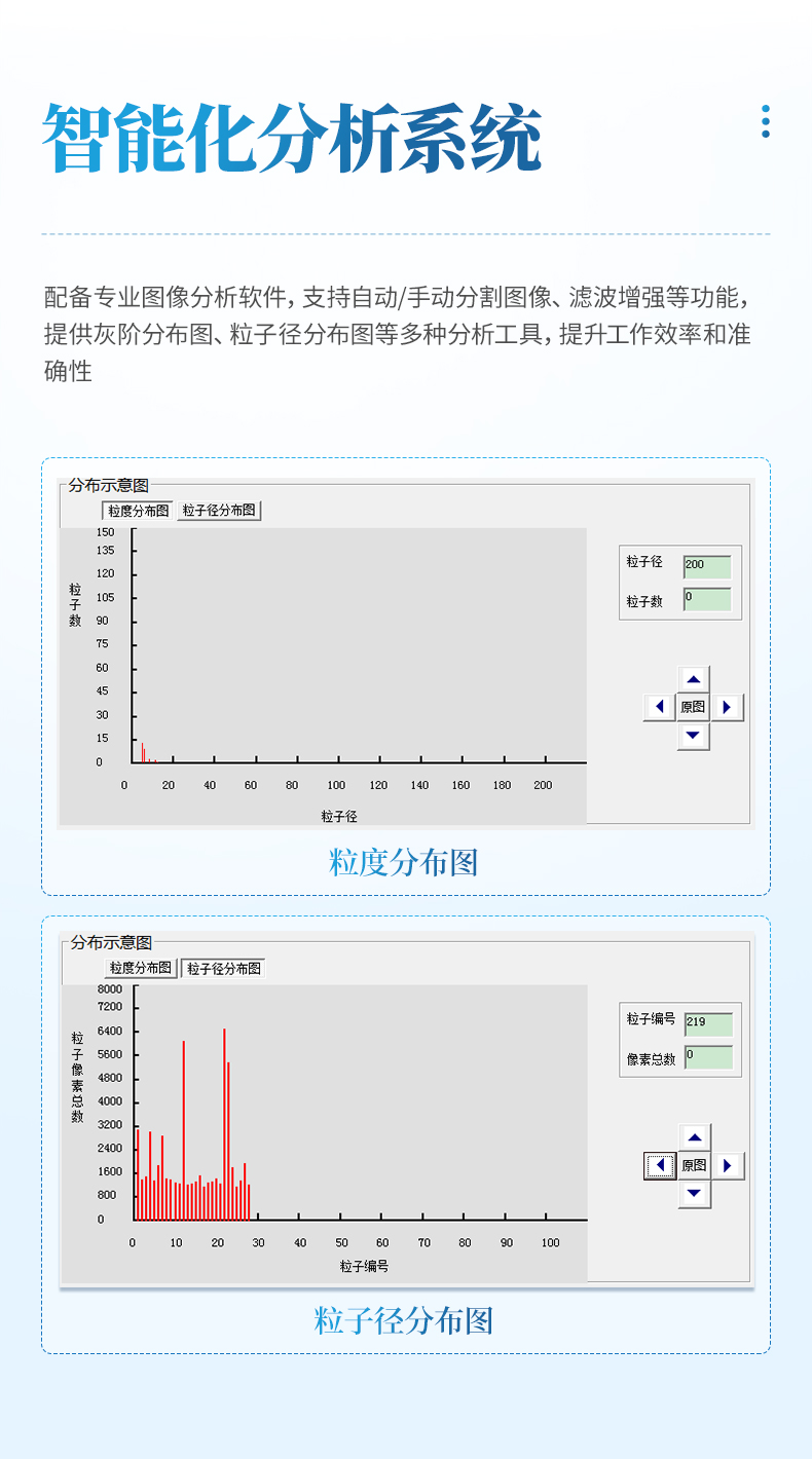 u 提供圖像灰階分布圖、粒子徑分布圖、粒度分布圖;