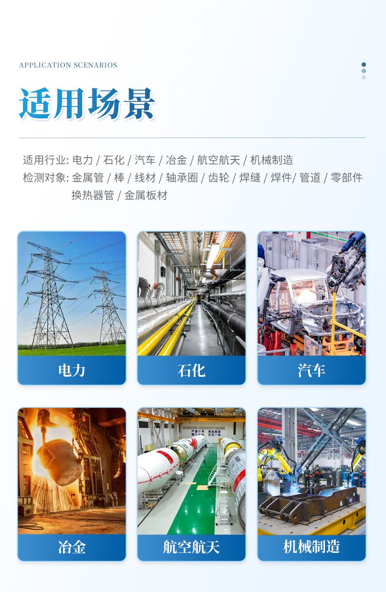 適用于無縫管、焊管等金屬管、棒、線材的在線、離線探傷,也可用于機械零部件的自動探傷,儀器同時備有差動、絕對通道,一個差動檢測突變缺陷,一個絕對通道檢測緩變缺陷、長通傷;雙頻可以使用一個高頻檢測表面缺陷,一個低頻檢測內部陷,保證較好的檢測效果。