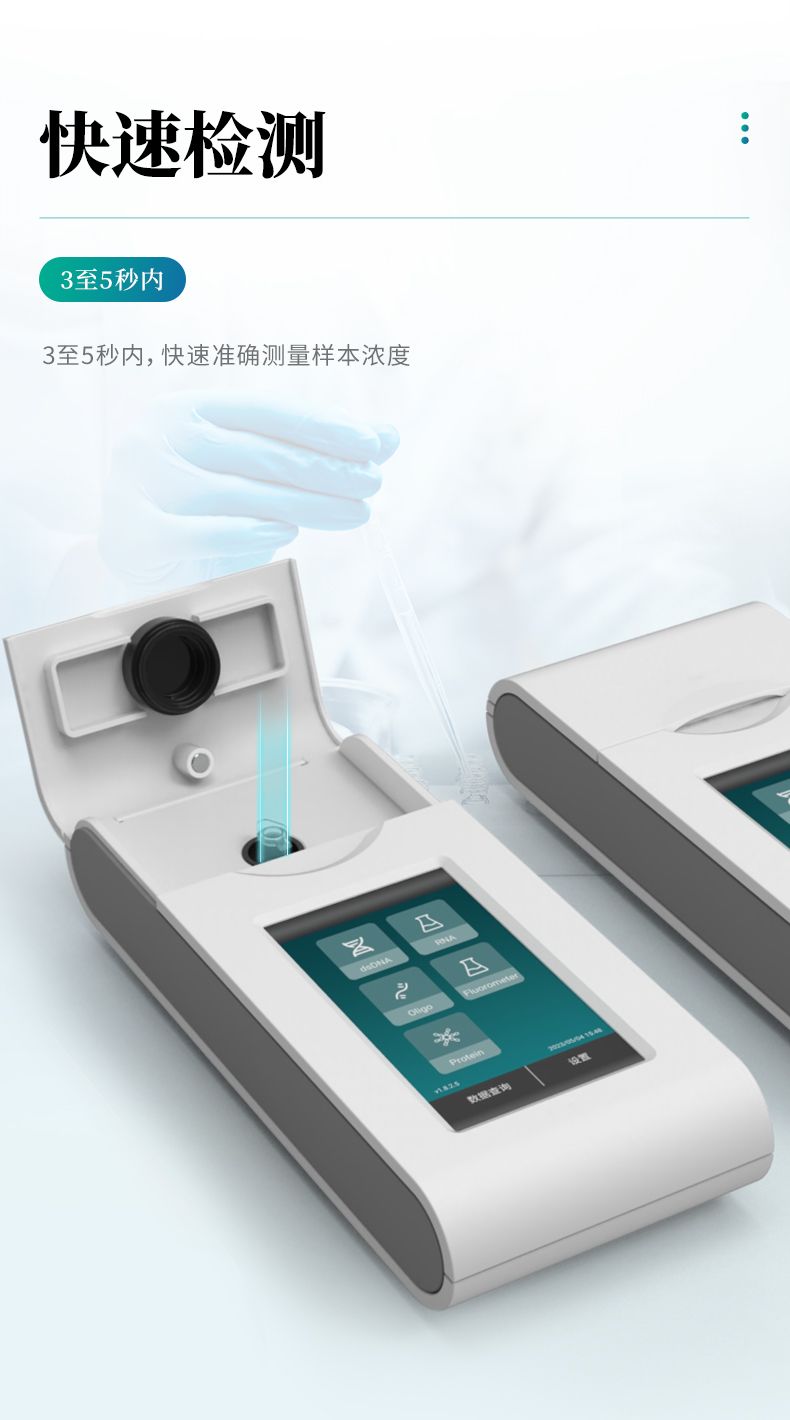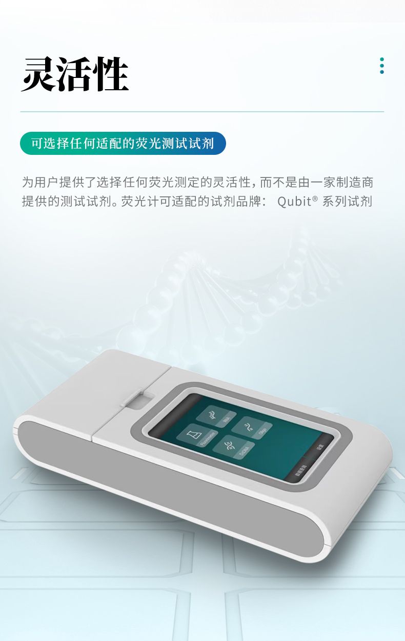熒光計采用熒光檢測原理,上樣體積僅需1-20ul,配合相應的定量試劑即可實現精確濃度定量。熒光計為開放平臺,可靈活 適配不同試劑品牌,如Qubit? dsDNA 定量試劑盒, ssDNA 定量試劑盒,RNA 定量試劑盒, microRNA定量試劑盒等,以 及其它品牌適配Qubit? 4設備的定量試劑盒。
