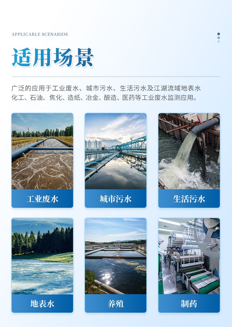 廣泛應用于應急監測、工業廢水、生活污水、污水處理、醫藥化工、食品、飲品、紡織印染、電鍍、造紙、石油冶金、河流治理、科研單位、院校等領域。