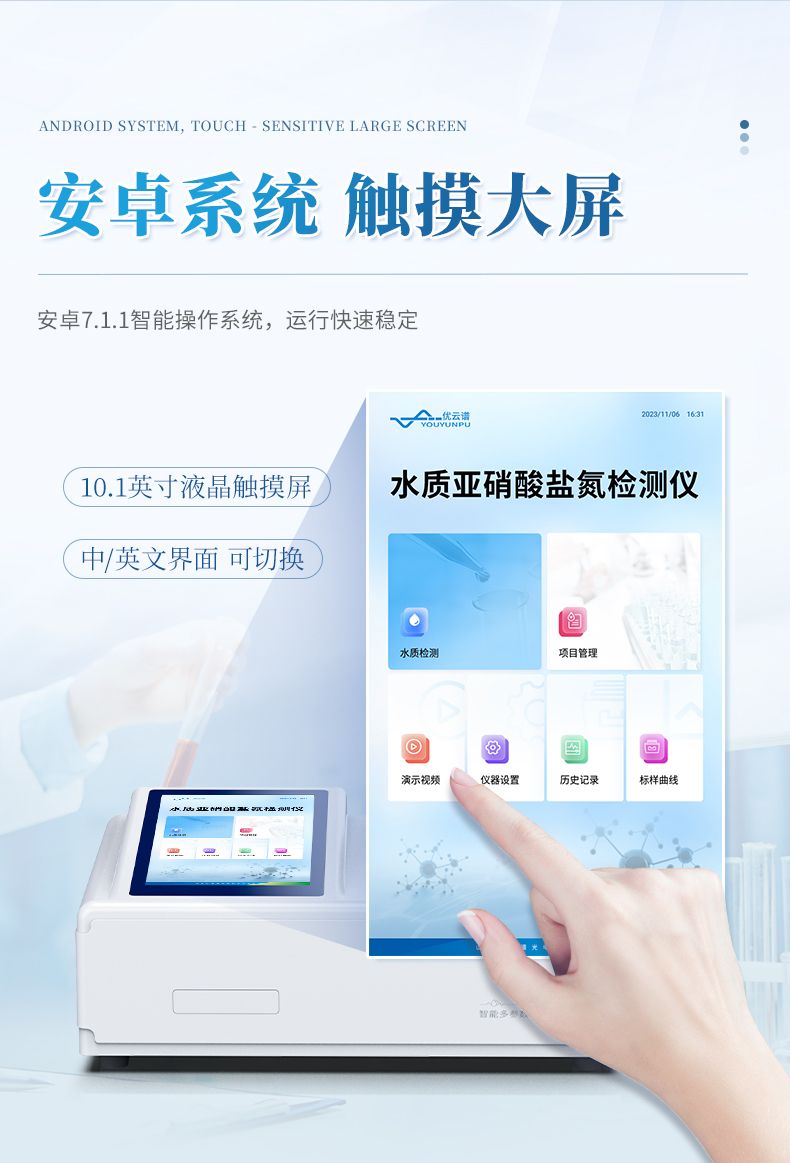 手持式亞硝酸鹽氮檢測儀主要檢測水體中的亞硝酸鹽氮含量;參考方法《變色酸光度法》研發設計制造,儀器配備高清晰度彩色液晶觸摸顯示屏,Android智能操作系統,中文顯示界面,中英文鍵盤,人性化操作,使用更簡單;