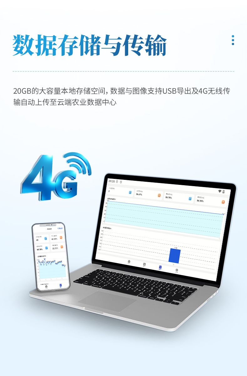 6. 數據存儲與傳輸:提供20GB的大容量本地存儲空間,數據與圖像支持USB導出及4G無線傳輸自動上傳至云端農業數據中心,用戶可通過專用賬號訪問并以表格形式下載