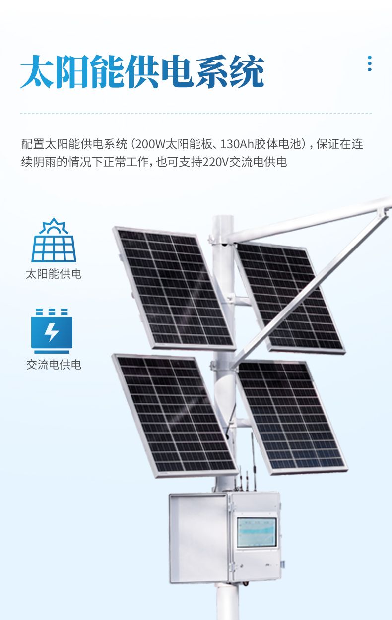 7. 配置太陽能供電系統(200W太陽能板、130Ah膠體電池),保證在連續陰雨的情況下正常工作,也可支持220V交流電供電