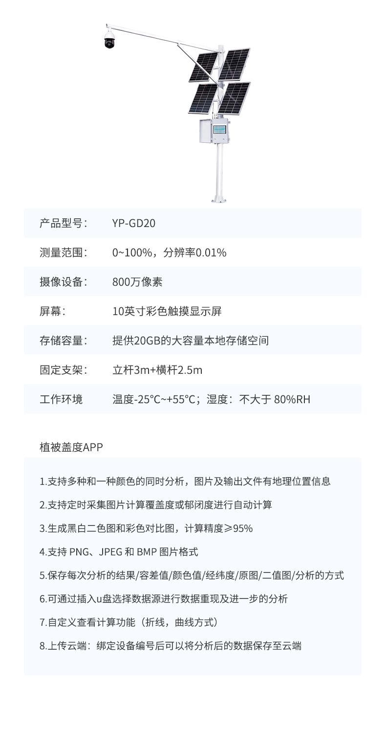 植被蓋度分析系統根據圖像識別原理來實現自動分析,用于植被覆蓋度和郁閉度的精確測量。儀器具有良好的防水性能,并帶有太陽能供電系統,可在戶外環境下長期自動定時采集分析,獲取植被長期生長變化情況。