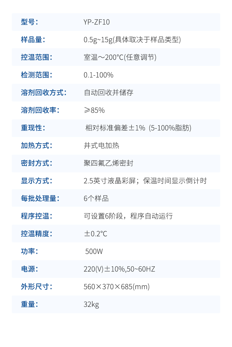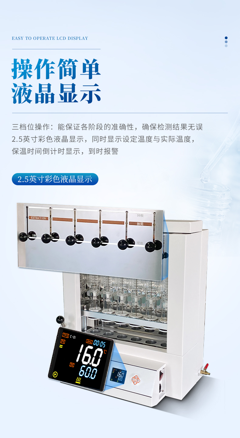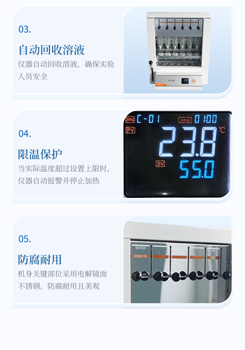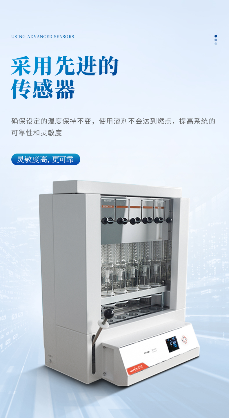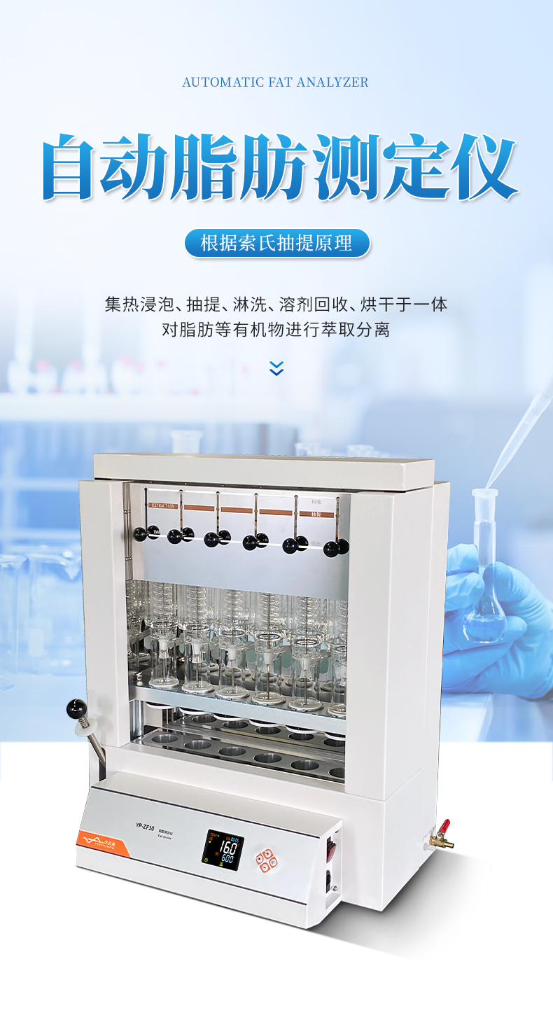 自動(dòng)脂肪測(cè)定儀(索氏提取儀)是根據(jù)索氏抽提原理,集熱浸泡、抽提、 淋洗、溶劑回收、烘干于一體,對(duì)脂肪等有機(jī)物進(jìn)行萃取分離的儀器。儀器采用了自 動(dòng)控溫、全封閉井式電加熱形式,使儀器加溫更為均勻,安全可靠,并具有良好的密 封設(shè)施,從而達(dá)到快速準(zhǔn)確的目的;最大限度降低溶劑用量,自動(dòng)回收溶劑,節(jié)省分 析成本。具有設(shè)計(jì)合理、操作簡(jiǎn)單、精確度高、性能穩(wěn)定、重現(xiàn)性 好、省力、省時(shí)等優(yōu)點(diǎn)。