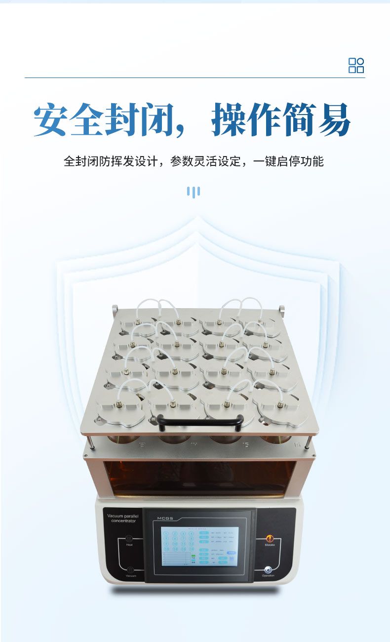 操作簡便、安全:靈活的工作參數(shù)設定、方便的樣品置入/取出過程,易學易用;蒸發(fā)通道全封閉設計可避免有機揮發(fā)組份對儀器及操作人員的傷害。