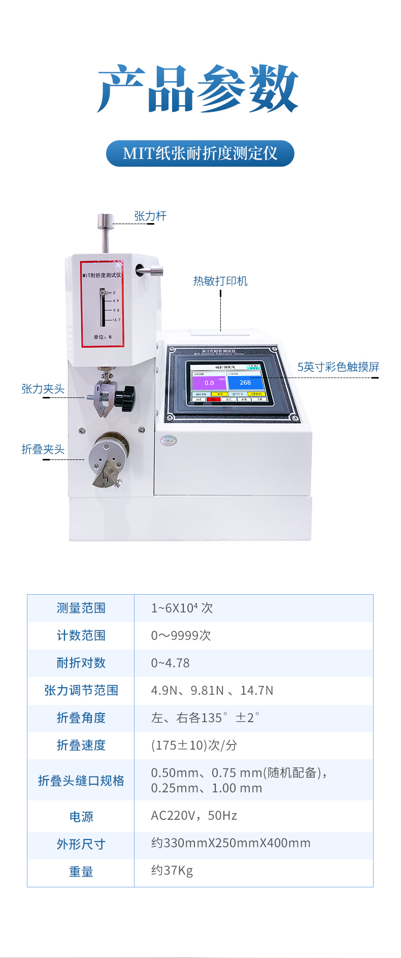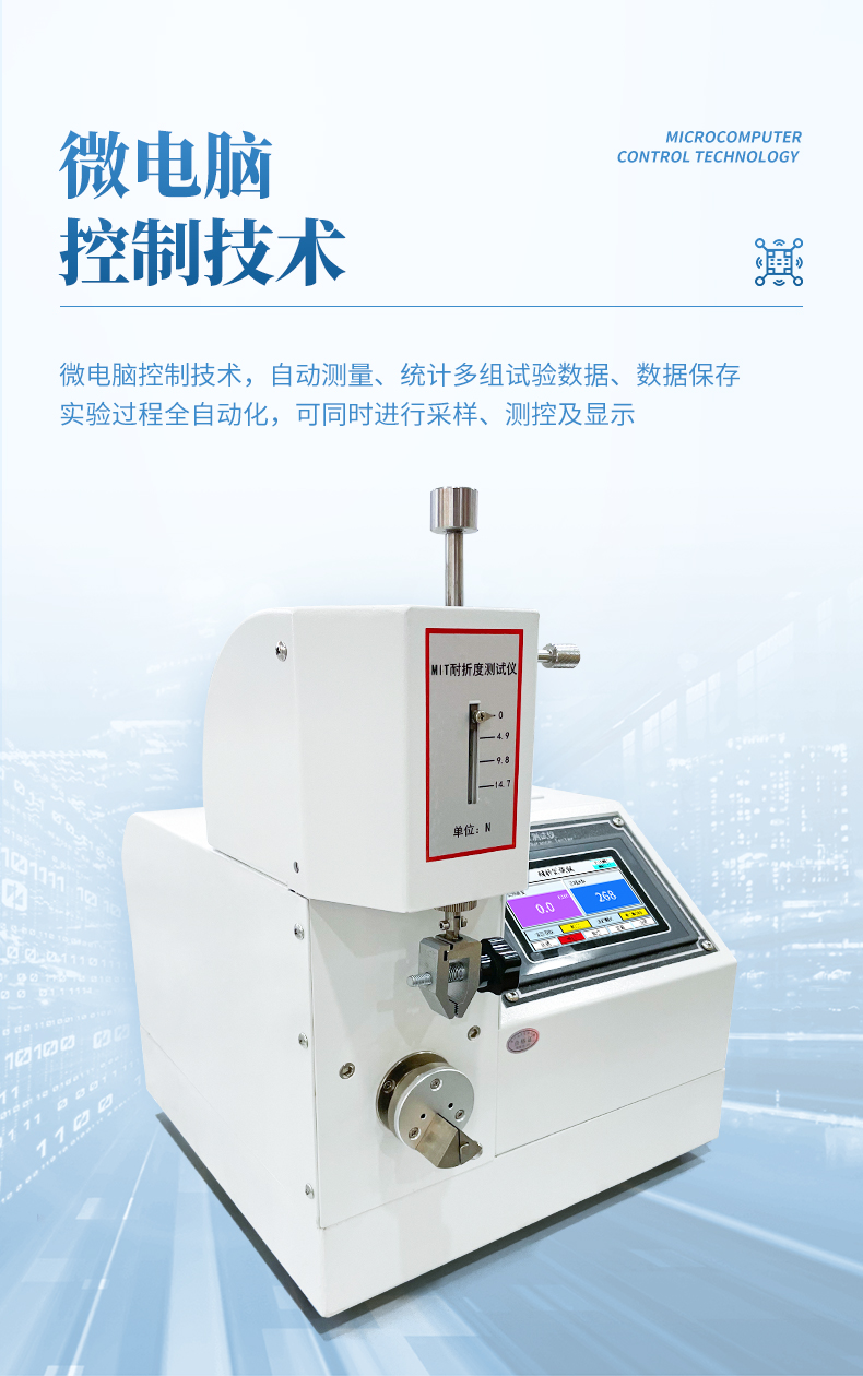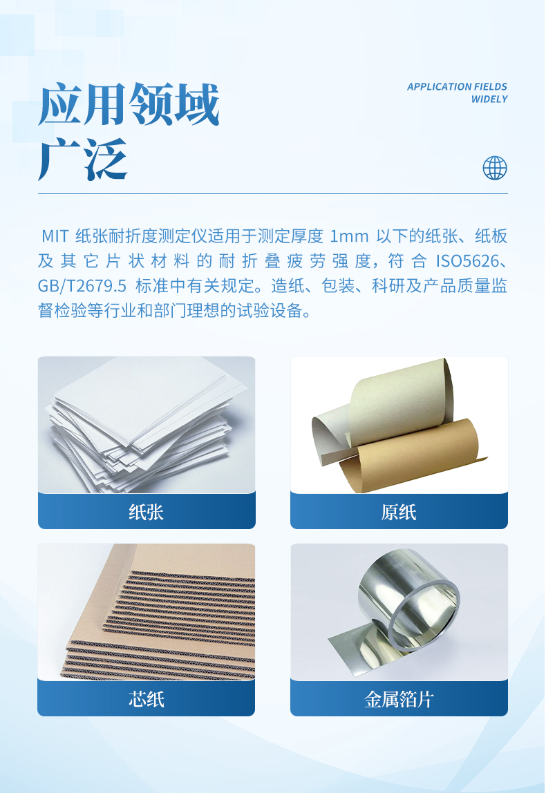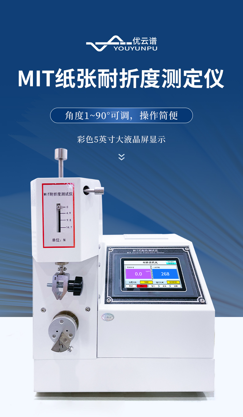 MIT紙張耐折度測定儀適用于測定厚度1mm以下的紙張、紙板及其它片狀材料的耐折疊疲勞強度,符合ISO5626、GB/T2679.5標準中有關規定。造紙、包裝、科研及產品質量監督檢驗等行業和部門理想的試驗設備。